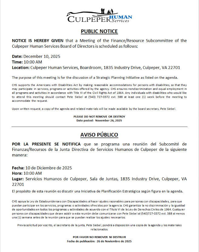 Please file an application the same day that you contact the agency. Applications may be returned to Culpeper Human Services either in person, through an authorized representative, facsimile, mail, or by completing an online application. Applications may also be filed through the Department of Social Services Call Center at (833-522-5582). The date of the application will be the protected date for when benefits are to begin upon approval.